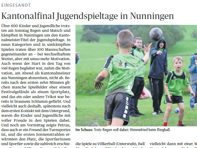 Am letzten Sonntag, 14. September 2025 fand in Nunningen der Kantonalfinal Jugendspieltage statt. Die Jugi Himmelried hat mit einem gemischten Team in der Kategorie Unterstufe teilgenommen. Erfreulicherweise sind im entsprechenden Beitrag im Wochenblatt zwei unserer Jugendriegeler in Grossaufnahme abgebildet: (Link zum PDF)